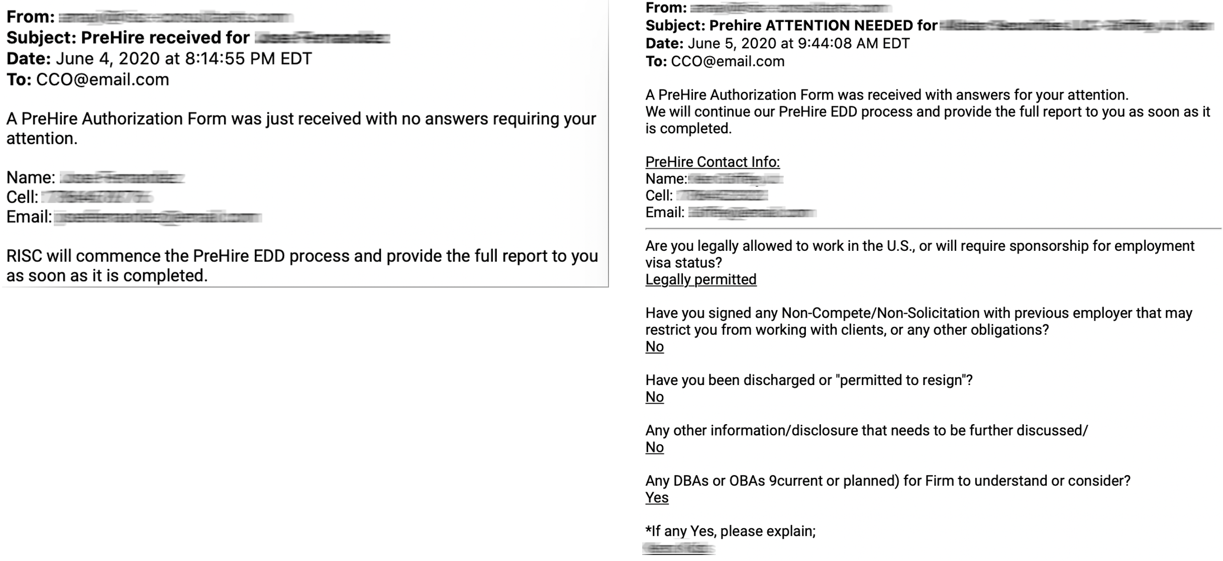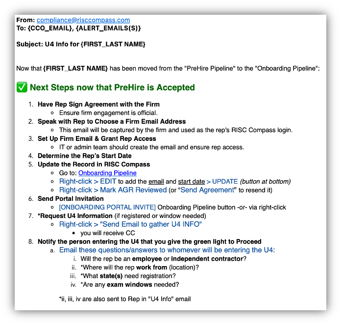 Example: Email is sent to CCO/Compliance reminding of next steps once candidate is accepted